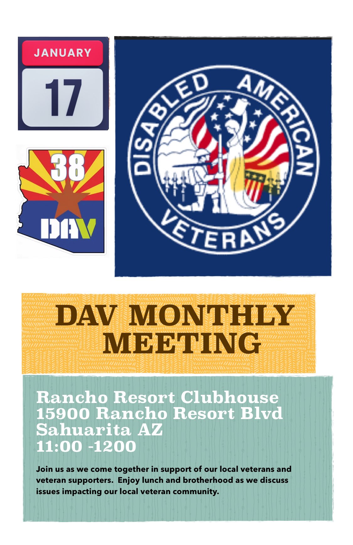 The Disabled American Veteran's of Sahuarita/Green Valley Chapter #38 meet every third Saturday of the month. "There are nearly 20 million veterans in the U.S. Each one has been affected by their service. DAV helps veterans of every generation address their challenges and achieve personal victories, great and small, to better thrive in civilian life."