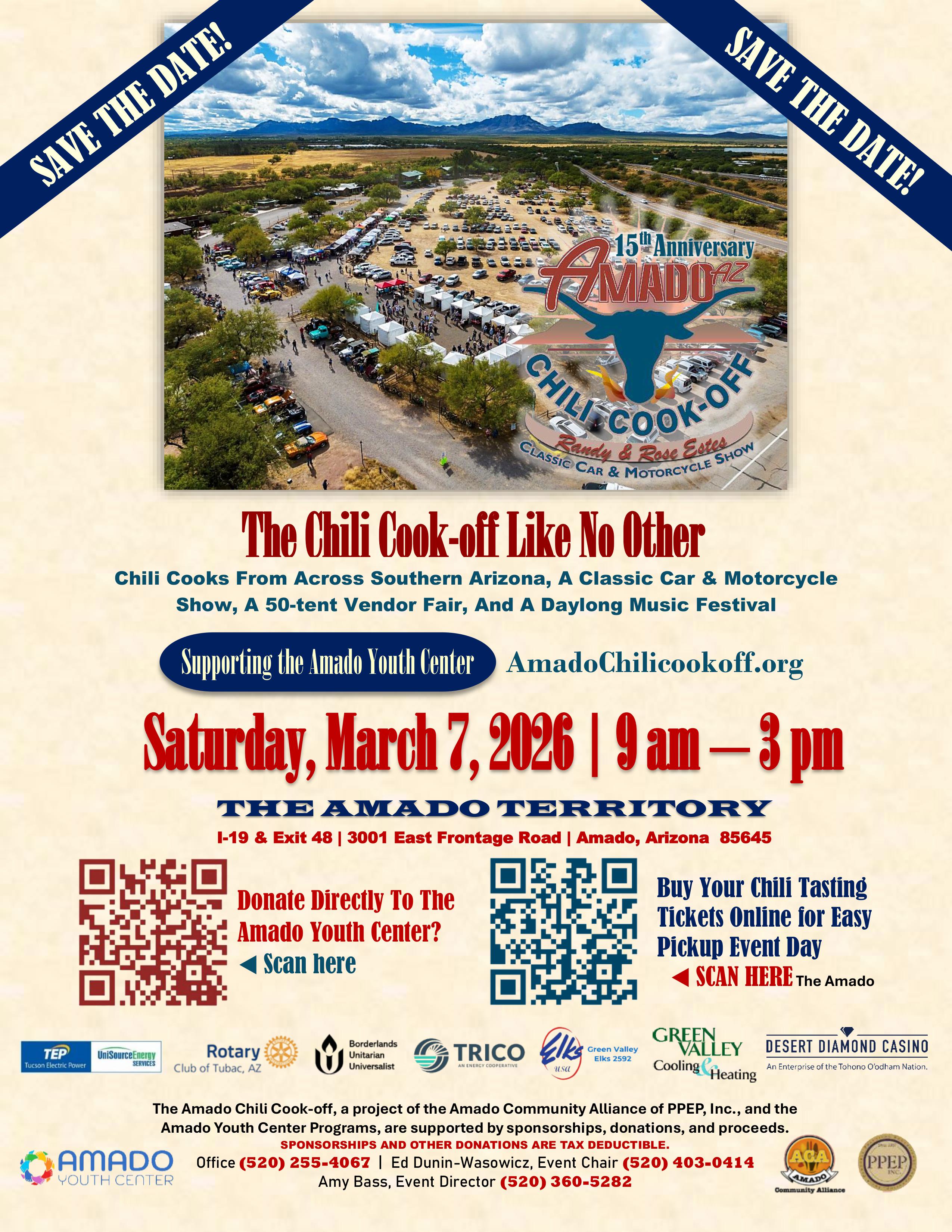 The Chili Cook-off Like No Other returns on Saturday, March 7, 2026, with chili cooks from across southern Arizona, an over 80-vehicle classic car and motorcycle show, a 54-tent vendor fair, and a daylong music festival. Location: The Amado Territory. I-19 & Arivaca Exit 48 | 3001 East Frontage Road | Amado, Arizona 85645 Parking is $5 or 5 cans of food. Chili Tasting Tickets are $10/person with unlimited sampling from 10:30 am - 12:30 pm, or until the chili runs out. Beat the crowd and buy your tickets online at www.amadochilicookoff.org (click link on homepage). Car Show contestants can register online for $30 until 5 pm, March 4th, or for $35 cash on the day of the event. Amado Youth Center 50-50 Raffle Visitors have the opportunity to participate for a cash prize. Registration Fees, Sponsorships, and Donations are tax-deductible and benefit the Amado Youth Center - the area's only safe after-school space - and its skill-building programs.